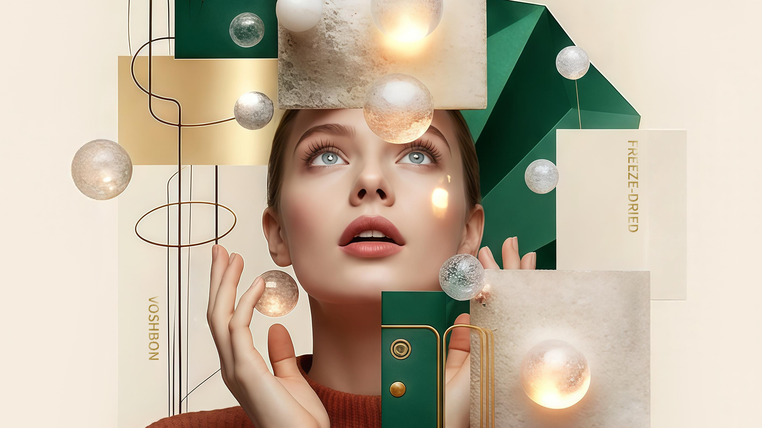 It is representing technology, purity, and transformation. The concept visualizes how Voshbon’s granule-to-foam technology reimagines skincare — weightless yet powerful, modern yet essential.